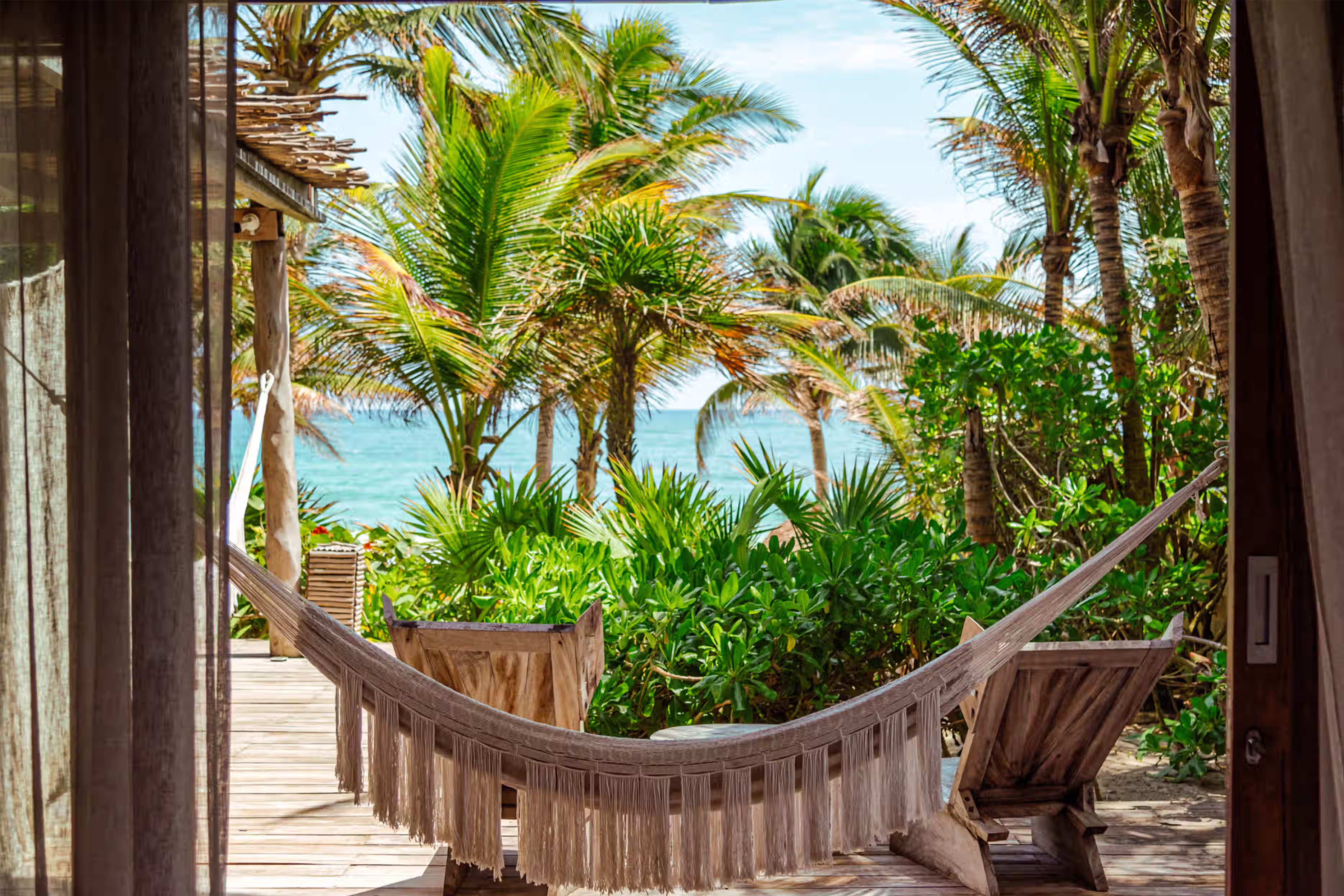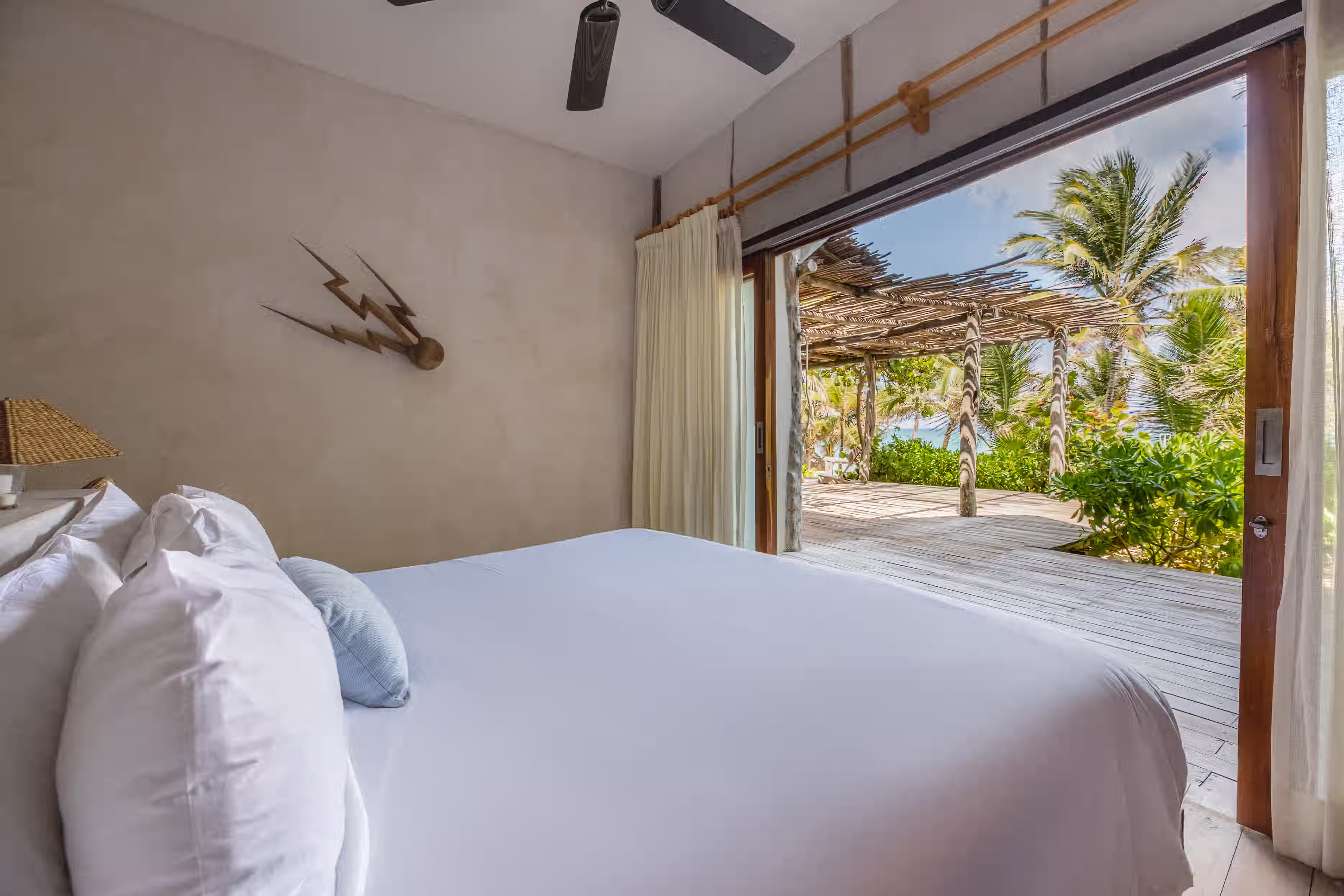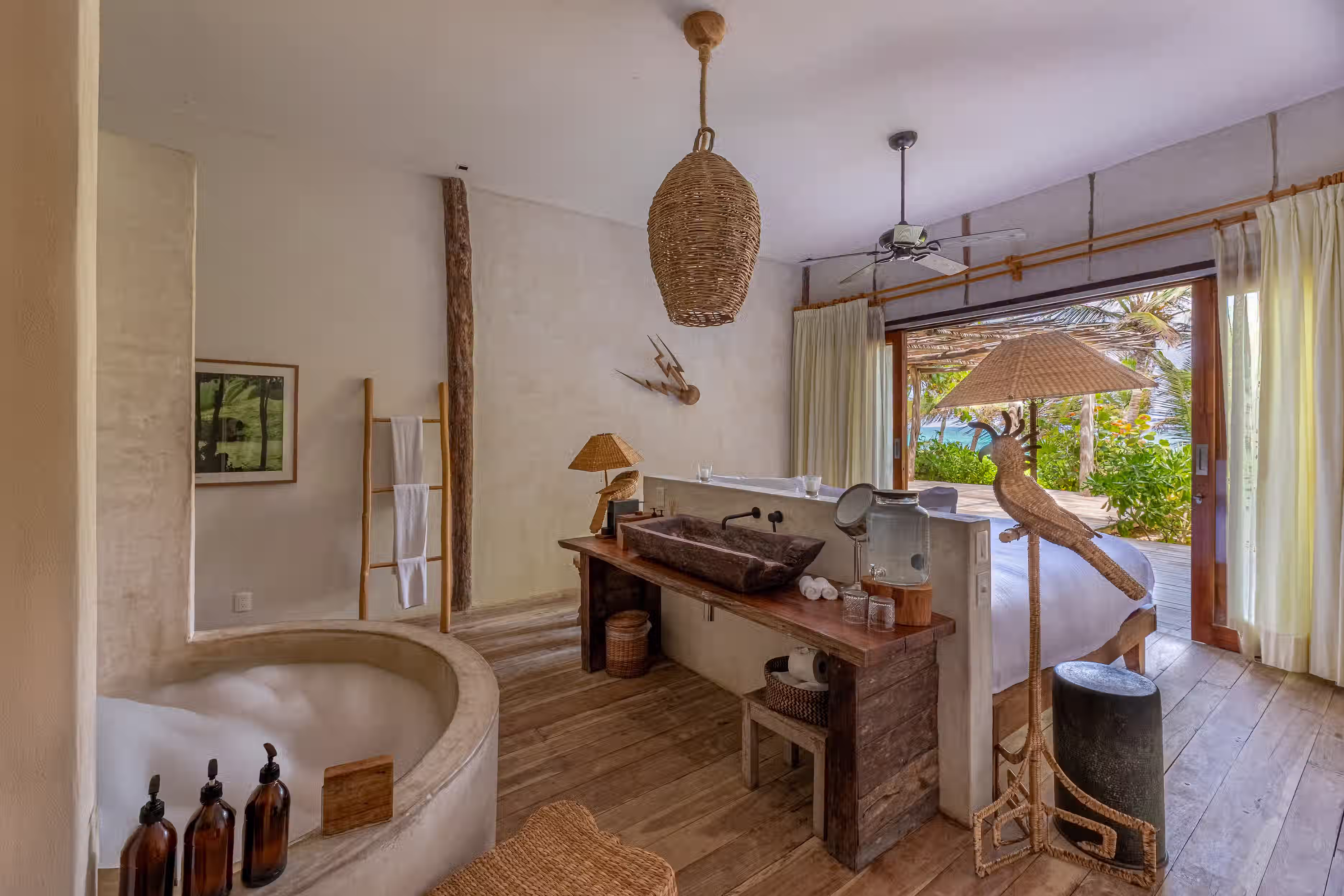 Oceanfront suites on the ground level with direct access to the beach and pool areas, featuring a king-size bed, indoor bathtub, and an effortless indoor-outdoor living experience steps from the sea.