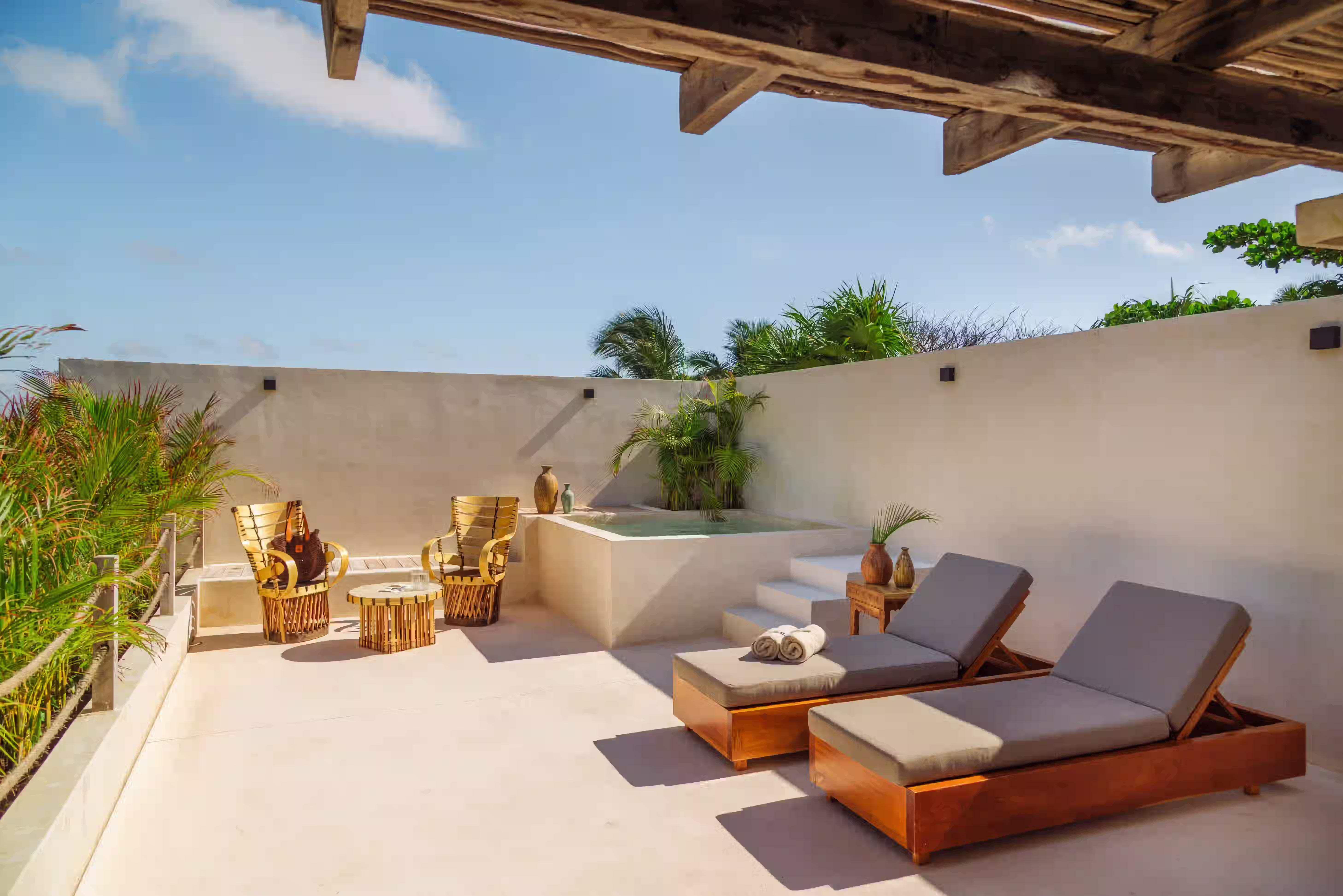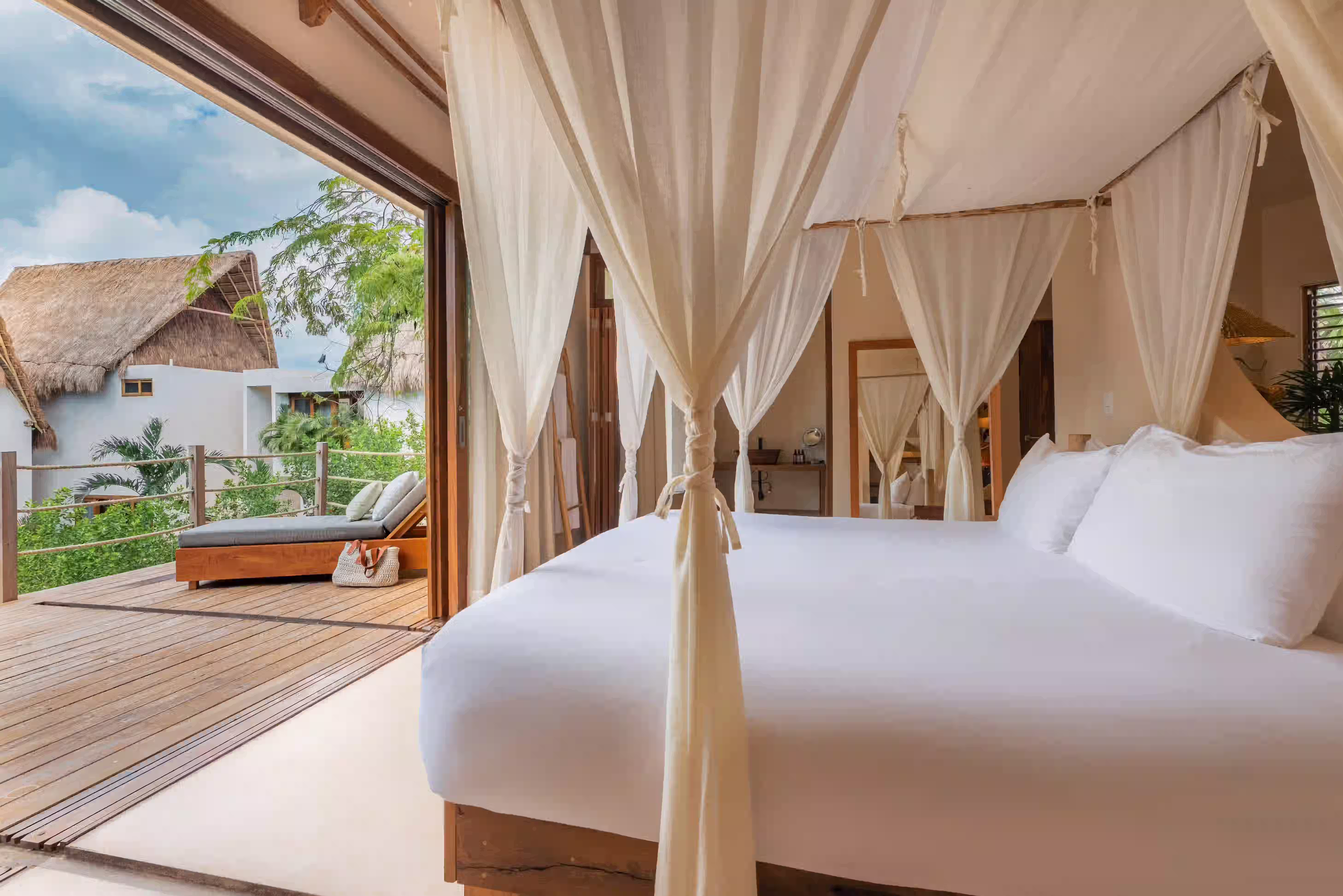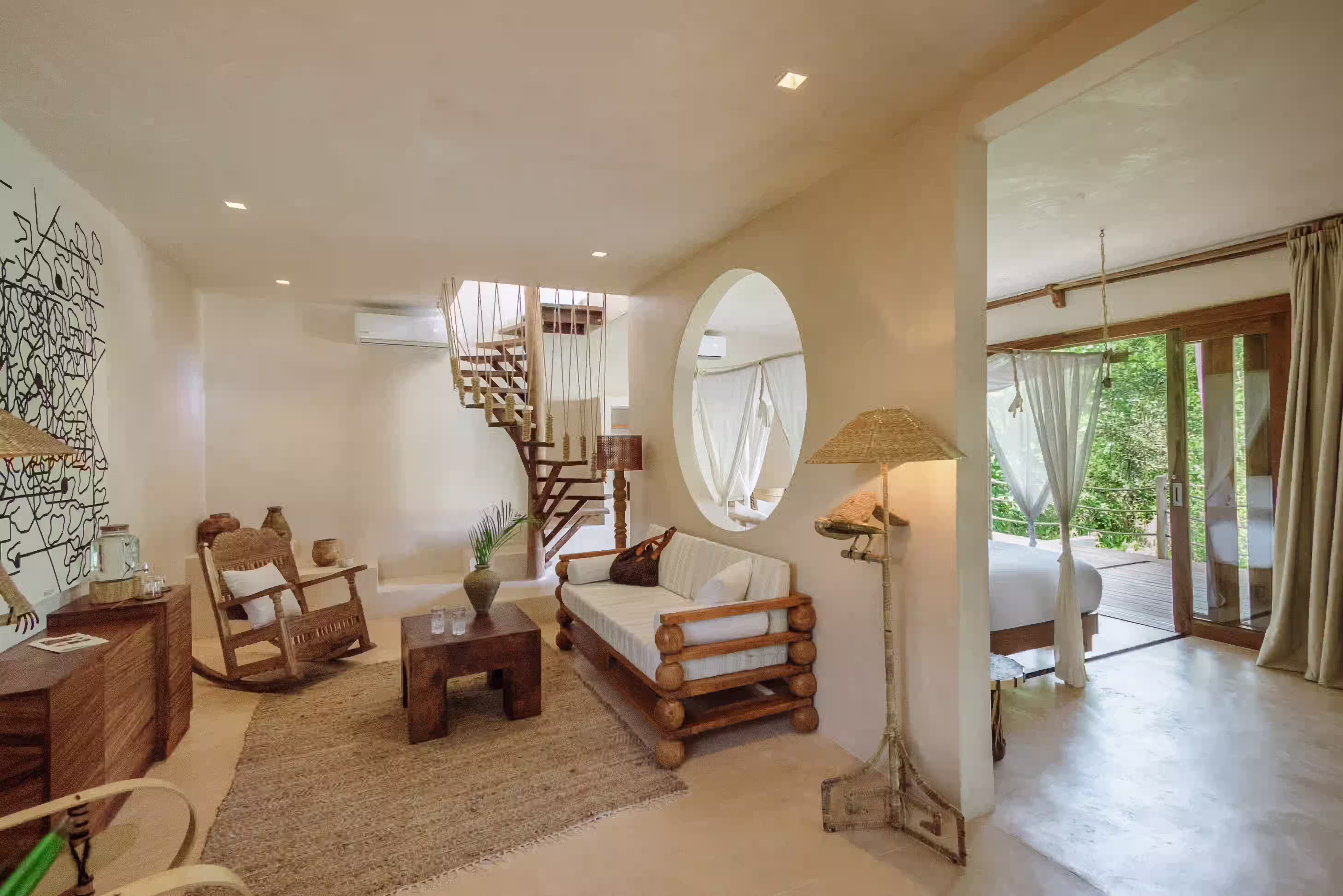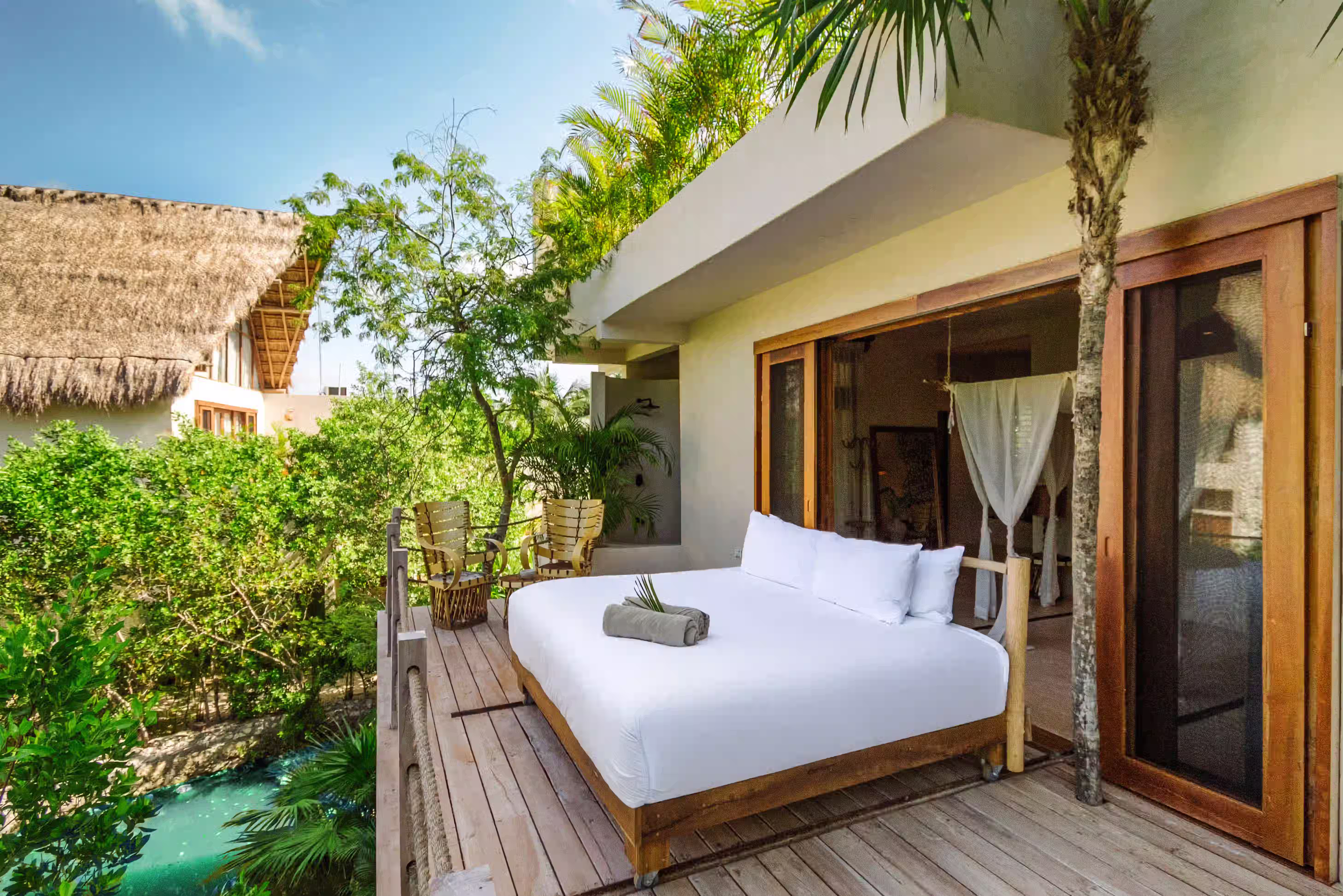 An exclusive upper-level suite overlooking the cenote, featuring a rolling king-size bed, private living area, and a spacious terrace with plunge pool—perfect for a secluded and immersive jungle experience.