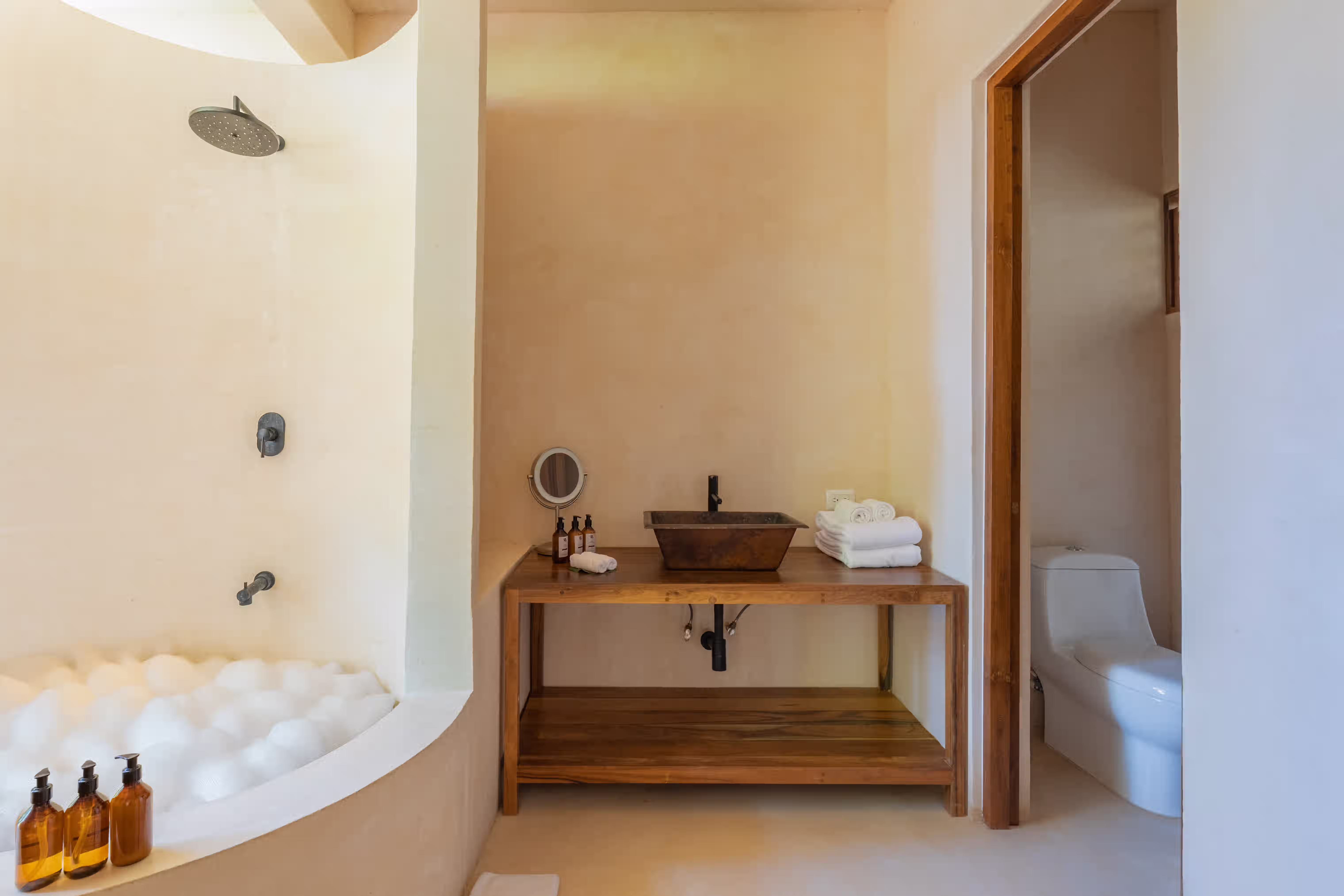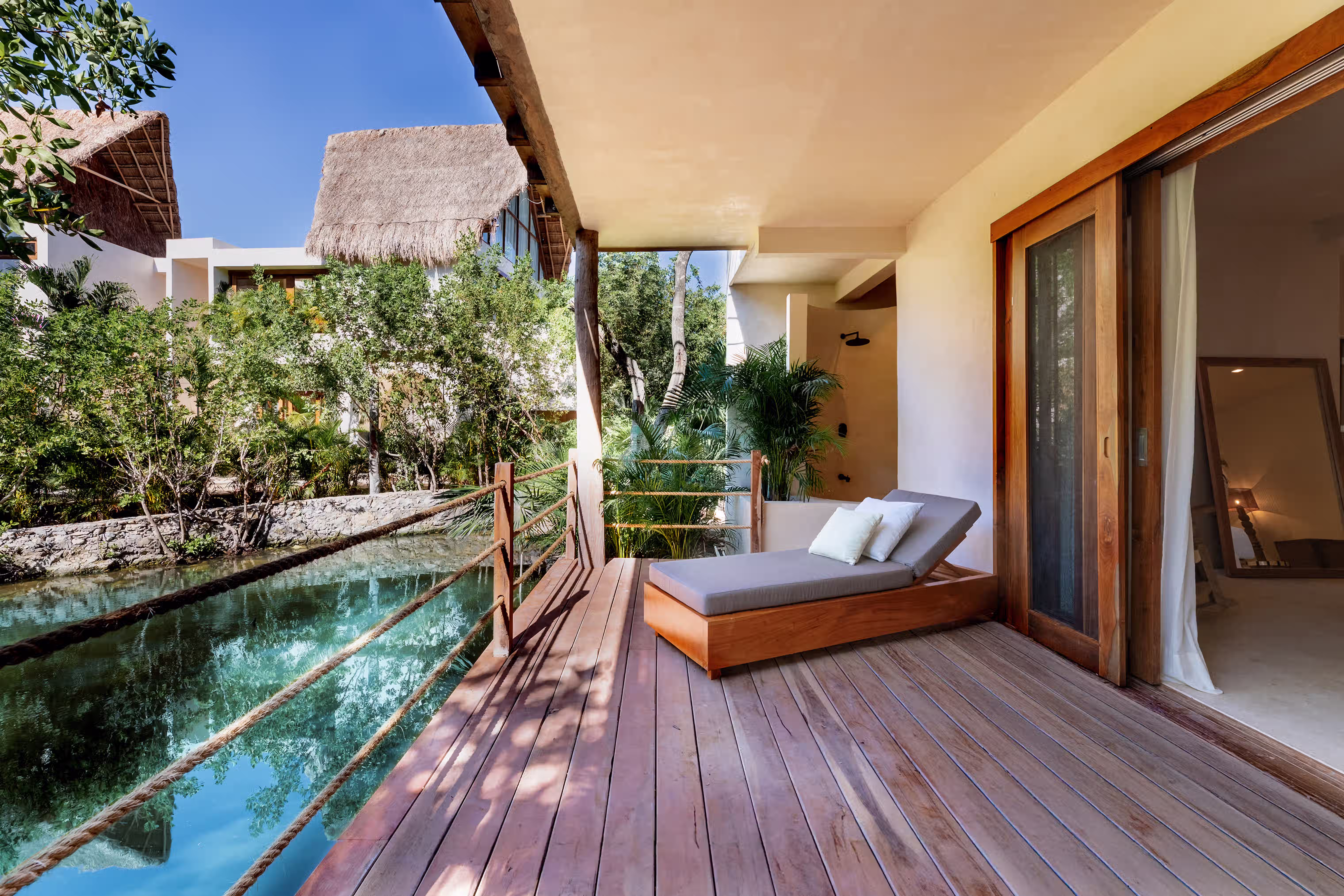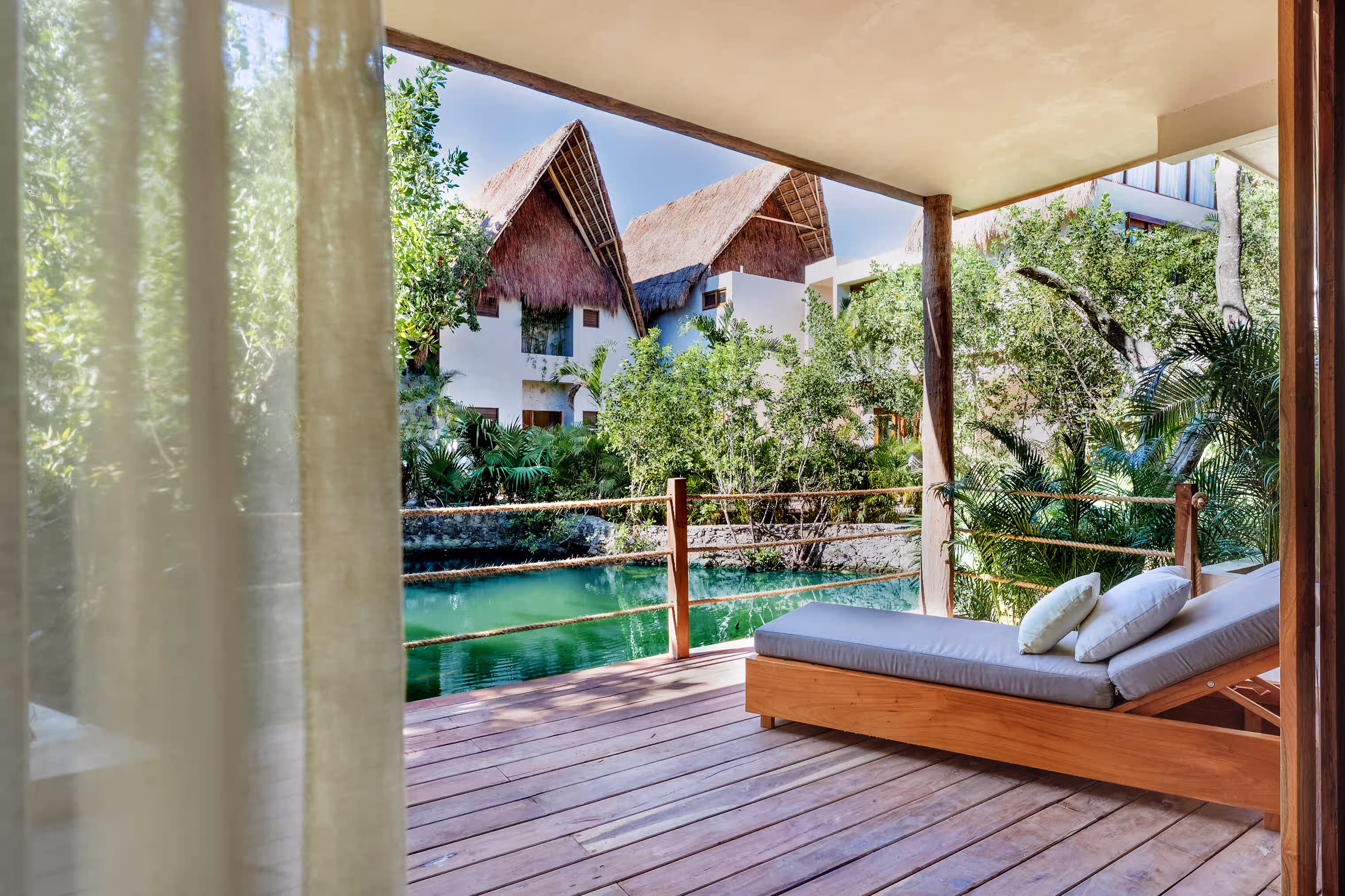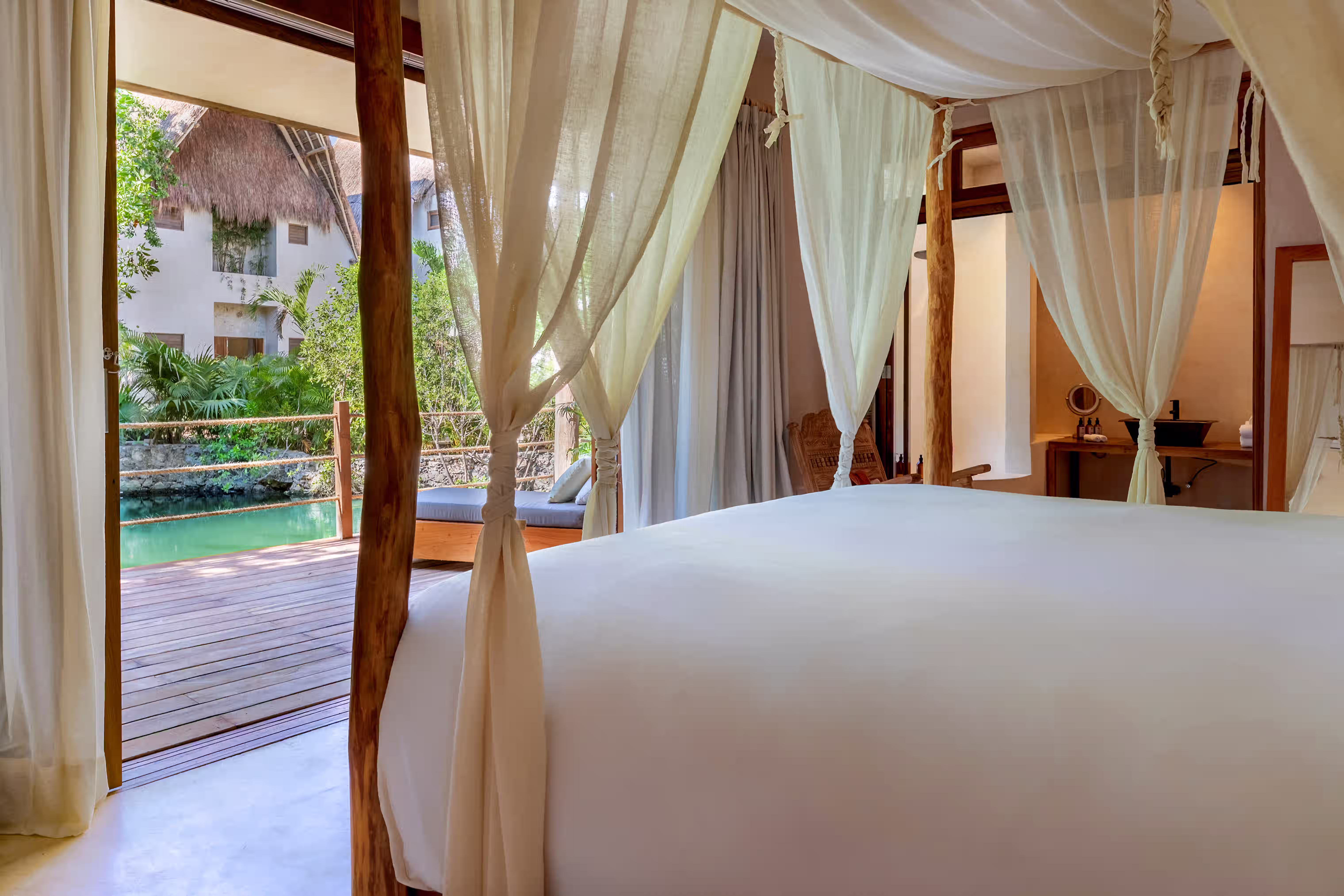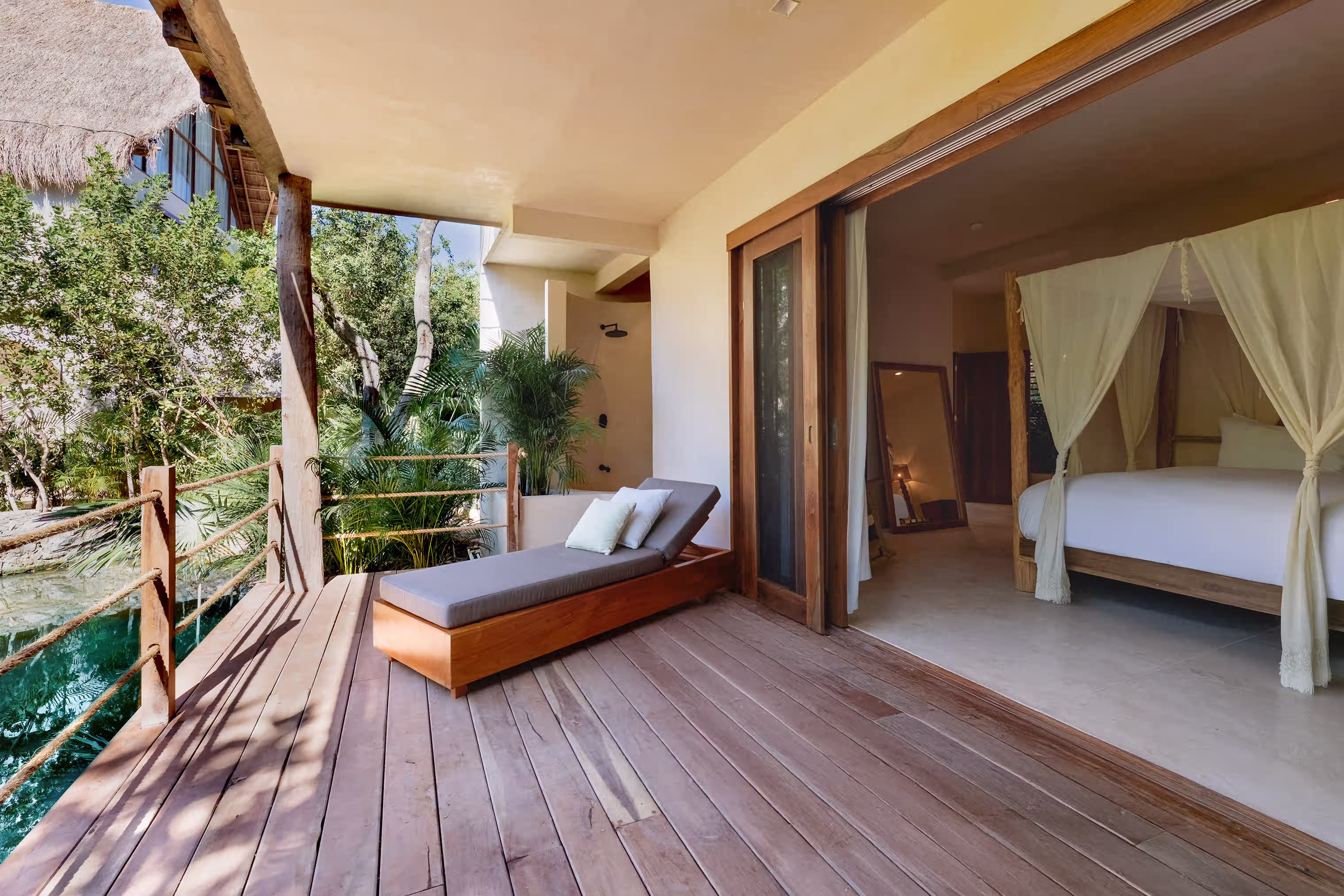A secluded lower-level suite facing the cenote, offering a king-size bed, private living area, and an outdoor deck with plunge pool, blending comfort with the raw beauty of the jungle.