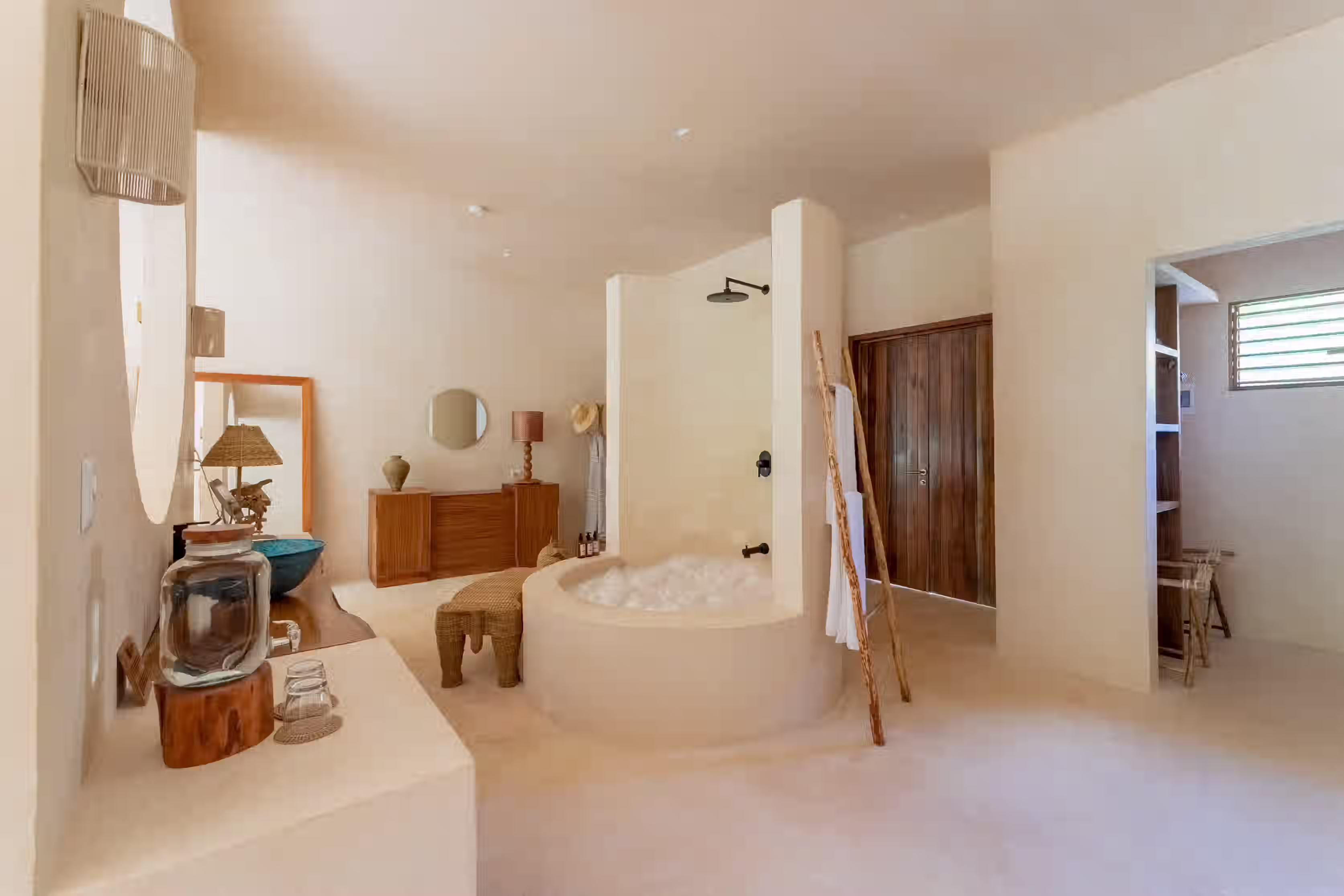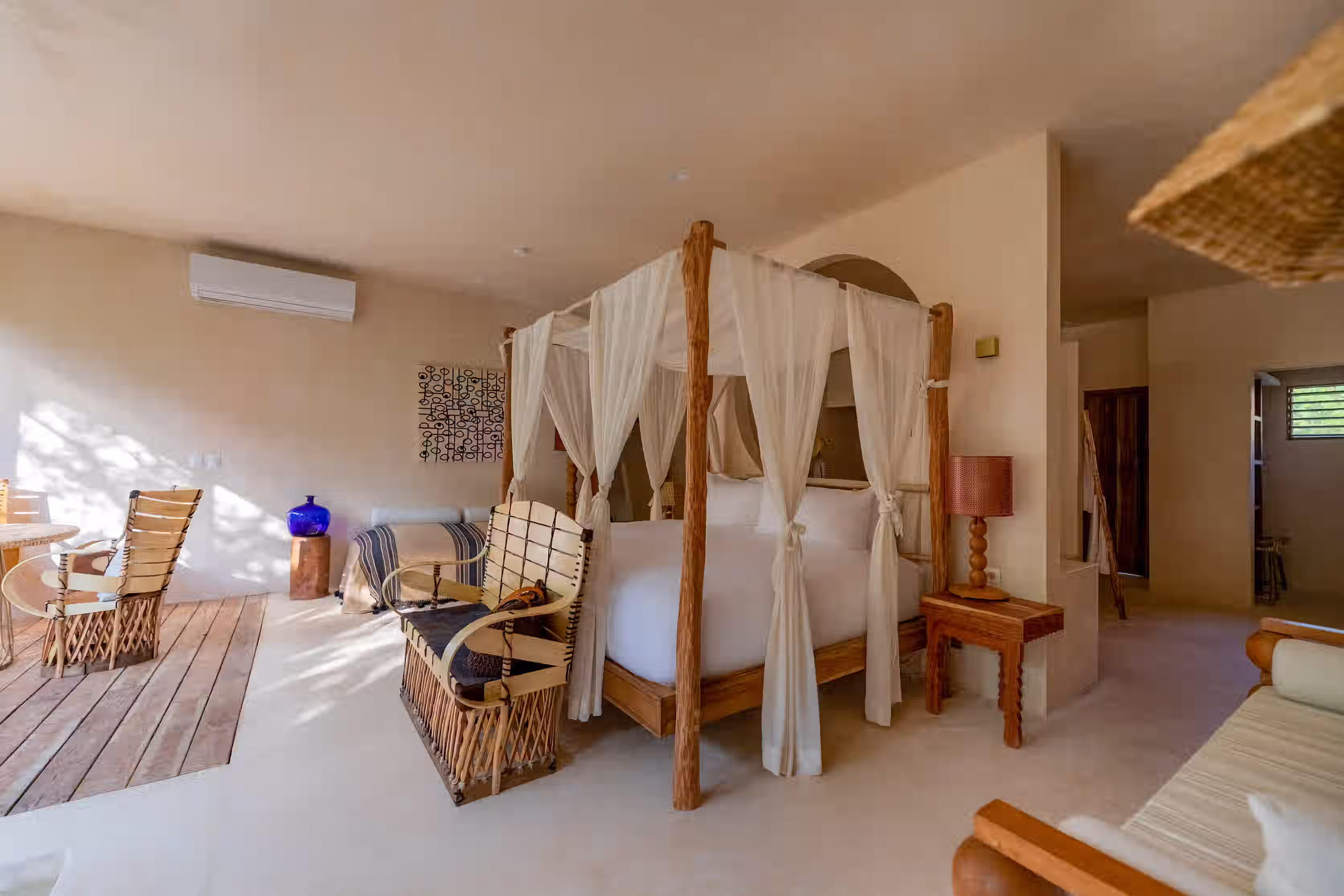 Elegant upper-level jungle suites with a rolling king-size bed and a mezzanine-style lounge, offering elevated views of the surrounding jungle canopy and a refined sense of privacy.